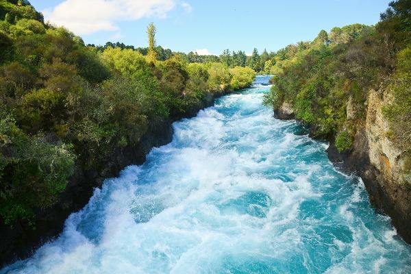 胡卡瀑布位于怀拉基观光公园内,从陶波驱车向北,只有数公里。经由西兰的陶波市新附近公路可达水量充沛、气势磅礴的胡卡瀑布,怀卡托河由12公尺高的河道断层冲泻而下,造成每秒230吨巨量的水流,浅蓝如宝石的怀卡托河因隘口及断层的作用,产生喷射及向下的巨大动力,形成泡沫般的水瀑宣泄而下。