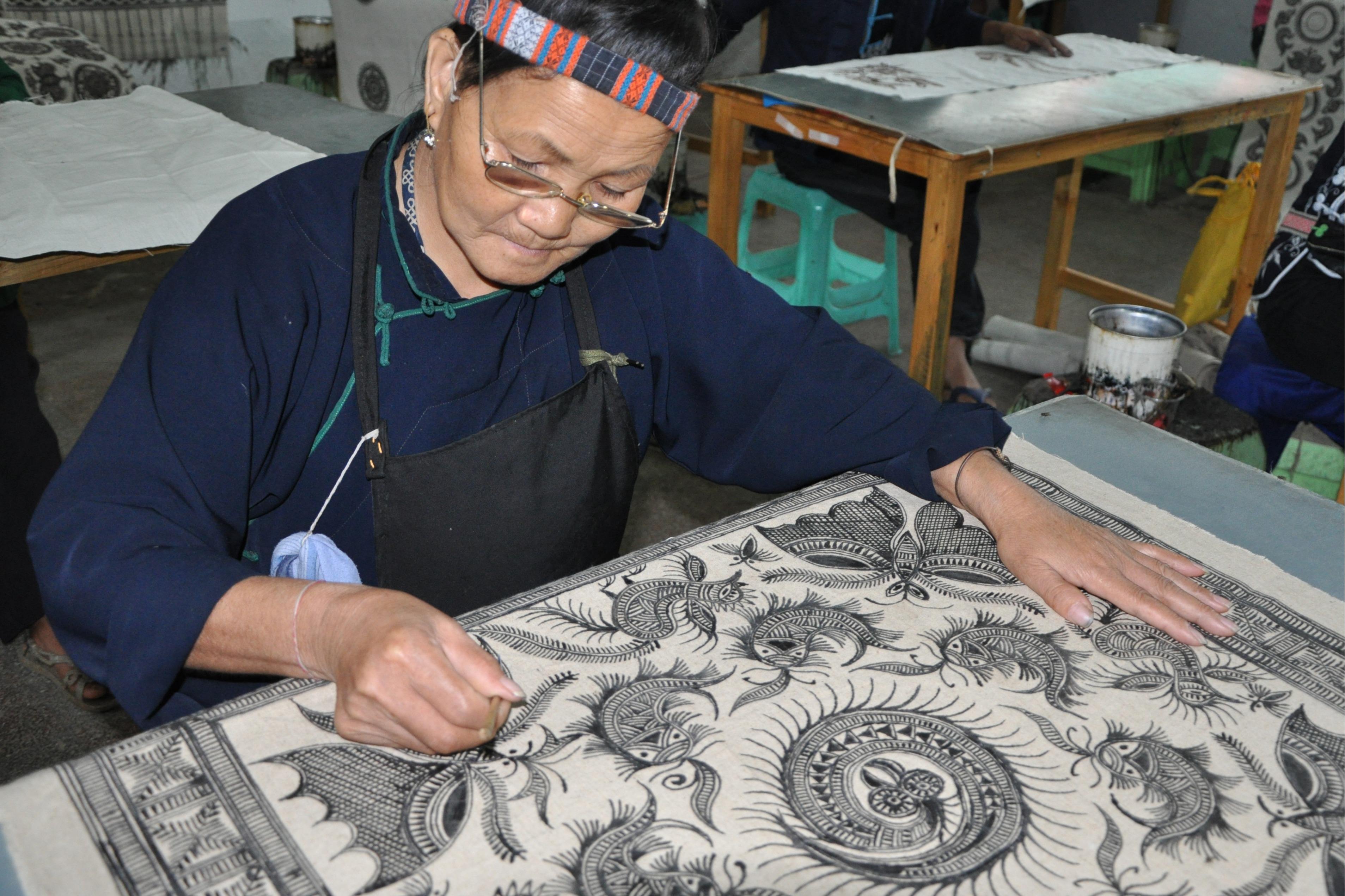 白裤瑶粘膏染,是一种取自神奇粘膏树粘液为防染剂的防染技艺。流程主要分为制作粘膏、绘制粘膏画、染色、脱膏三个部分。在老艺人的指导协作下完成制作。