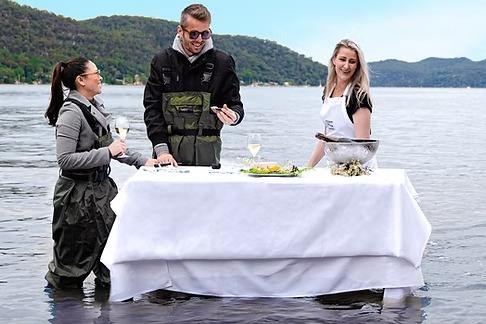 乘船游览牡蛎养殖场后,参与者将穿上防水靴,在我们最新的牡蛎养殖场下船。届时,会有工作人员迎接您,并引导您前往水下餐桌。准备好品尝您脚下这片水域中新鲜开壳的牡蛎吧! -每桌客人都会有自己的桌子,准备好相机吧!