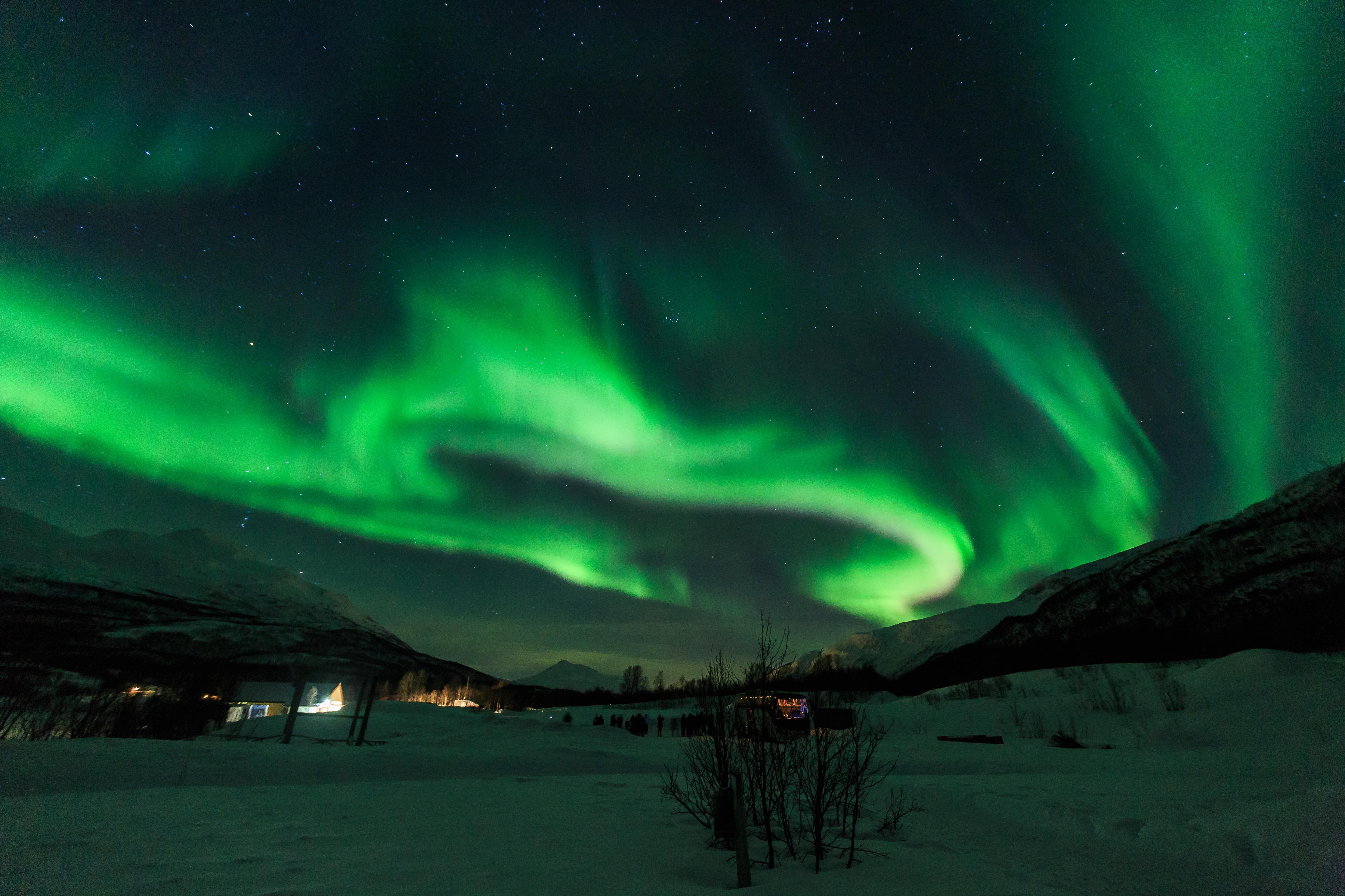 极光的每一次舞动都呈现出不同的姿态与不同的色彩。极光一般呈绿色,而在不同强度与不同大气条件下,还会出现紫色、粉色、红色、白色、蓝色!极光能否出现,取决于太阳风以及云层情况,在晴朗无云的夜晚最有机会捕捉到极光的踪影。
