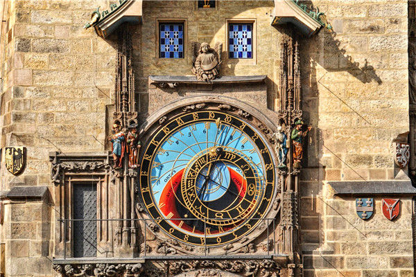 布拉格天文钟安装在布拉格老城广场的旧市政厅南面墙上,属于捷克哥特式科学和技术的登峰造极之作。天文钟分为上下二座,是一座精美别致的自鸣钟。每逢整点报时,12门徒像伴着钟声依次现身。